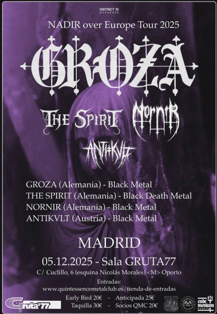 Este último evento supondría no tan solo la quema de unos meros últimos cartuchos, si no mas bien toda una autentica salva de fuego restallando y haciendo que la fría y larga noche pudiera pasar tal cual por una fase diurna de la misma intensidad de lo que aconteció. Nada más y nada menos que la novena fecha de la gira Nadir Over Europe y segunda de Nadir Over Spain. O lo que es lo mismo, la conjuración de 4 fuerzas tales como son Antikvlt, Black Metal que aún virando de Austria a Suecia, no llega a cortarse ni un pelo a la hora de escupir verdades como puños en el proceso. Nornir, Black Metal de corte mas clásico y old school proveniente del corazón de Sajonia central. The Spirit, Black/Death de calidad con cierto refinamiento melódico directo desde el corazón de la legendaria región del Sarre. Y por supuesto, Groza, Todo un oscuro torbellino de introspección Black Metalera desde la región de Bavaria.