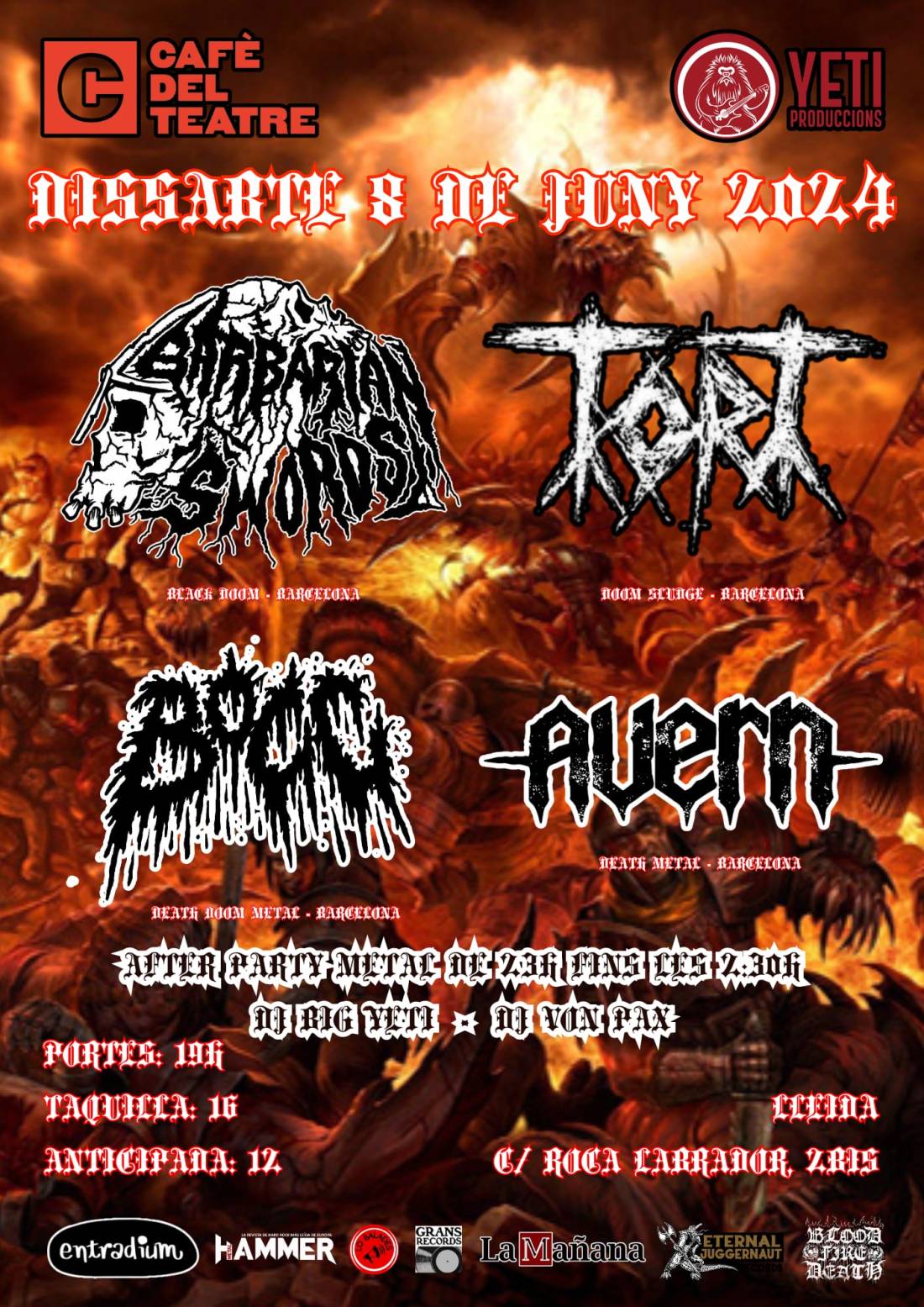 «BlackCelona» arrasa provincias. Previa BARBARIAN SWORDS + TORT + BOCC + AVERN (08.06.24 Café del Teatre, Lleida)