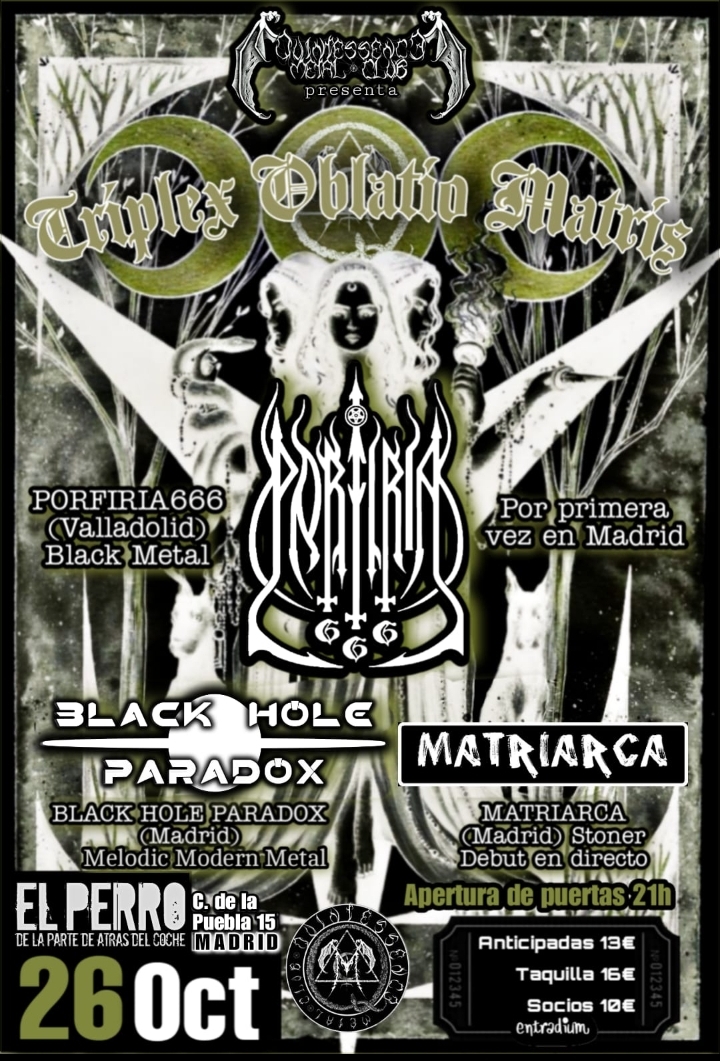 Previa TRIPLEX OBLATIO MATRIS, con PORFIRIA 666, BLACK HOLE PARADOX y MATRIARCA (26.10.24 Sala El Perro, Madrid)